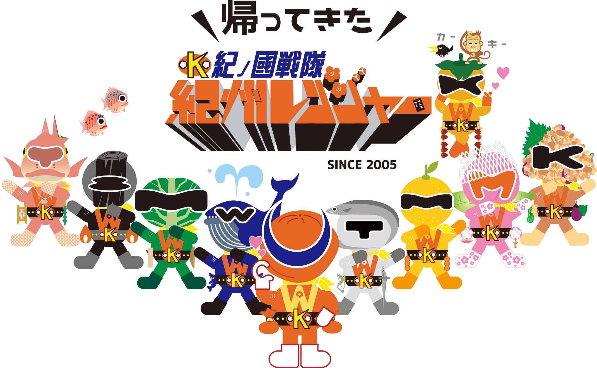 紀州レンジャー全員集合 全員集合 クラシックタイプ<紀州レンジャーが誕生したときのポーズです> ※最初はこのポーズでステッカーが配布されました。 ウメレンジャー クジレンジャー ミカンレンジャー タチレンジャー スミレンジャー メハリズシレンジャー キンザンジミソレンジャー ピーチレンジャー タイレンジャー カキレンジャー きゅんです♡ ウメきゅん♡ クジきゅん♡ ミカンきゅん♡ タチきゅん♡ スミきゅん♡ メハリズシきゅん♡ ミソきゅん♡ ピーチきゅん♡ タイきゅん♡ カキきゅん♡ 半分ハート♡ ウメ半分♡ クジ半分♡ ミカン半分♡ タチ半分♡ スミ半分♡ メハリズシ半分♡ ミソ半分♡ ピーチ半分♡ タイ半分♡ カキ半分♡ ガッツポーズ/応援 ウメ応援 クジ応援 ミカン応援 タチ応援 スミ応援 メハリズシ応援 ミソ応援 ピーチ応援 タイ応援 カキ応援 ページトップへ